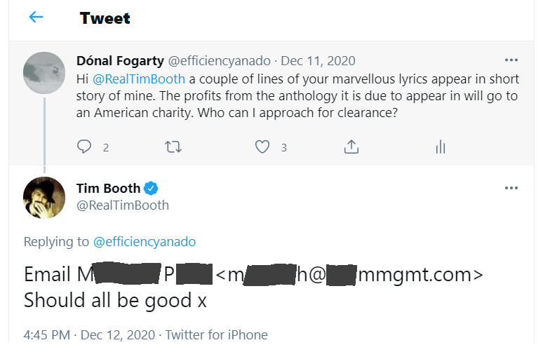 Somewhat ironically, in publishing a story about plagiarism in the film industry, my editor and I had to avoid inadvertently appropriating the work of another artist. Not an easy thing to achieve when your story is based around a song written by someone else. Fortunately, that someone else is Tim Booth, lead singer (and dancer!) of James, an artist who is as generous as he is creative. So, I reached out to him on twitter.
