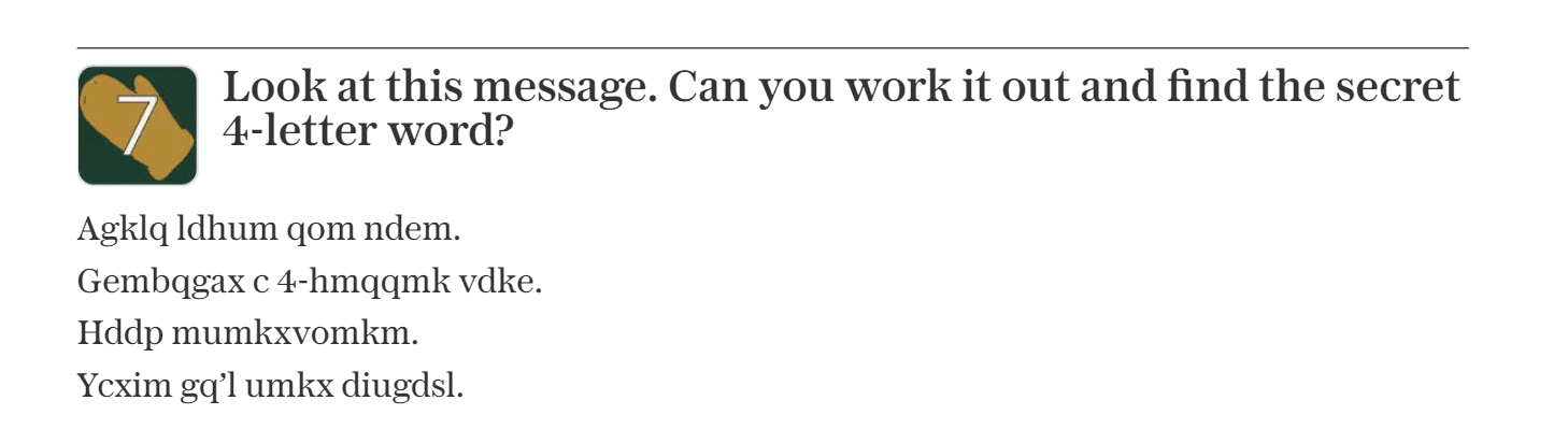 The GCHQ Christmas challenge is comprised of a series of seven increasingly complex puzzles that need to be solved to reveal a Christmassy message. The solution to each individual puzzle is a one-word answer which can follow ‘Christmas’ (e.g. Christmas Quiz).