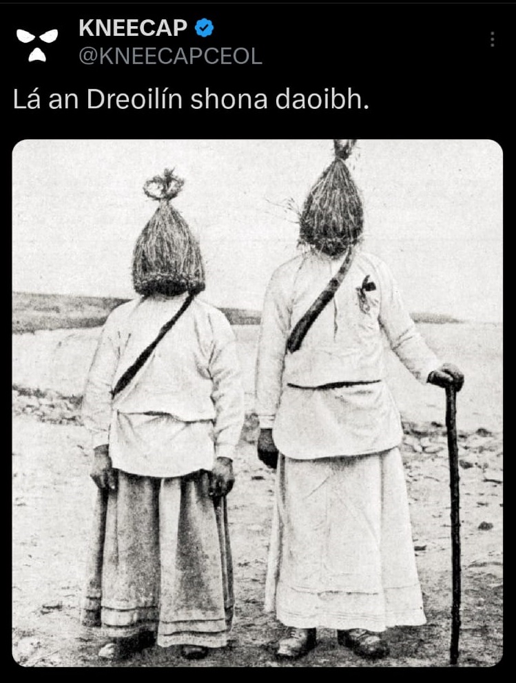 So, Lá an Blankety-blank shona daoibh is a seasonal greeting for a specific day (lá). Rearranging that into British English we get “Happy Day of the Blankety-blank to Yous”. Could our unknown word mean Boxing Day? Afterall, the photo and accompanying phrase was shared on Boxing Day. Well, such a diversion would be a wrong turn. The photo is a big contextual clue and I vaguely remember my late mother once telling me about an Irish tradition of dressing in masks and “hunting” something. The details are a little hazy, so I’m going to use the magic of the internet to remind myself and I’ll be right back.